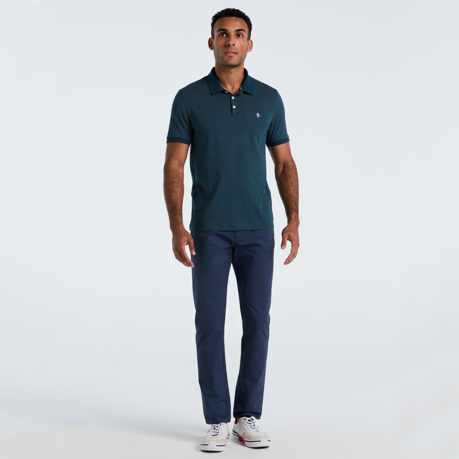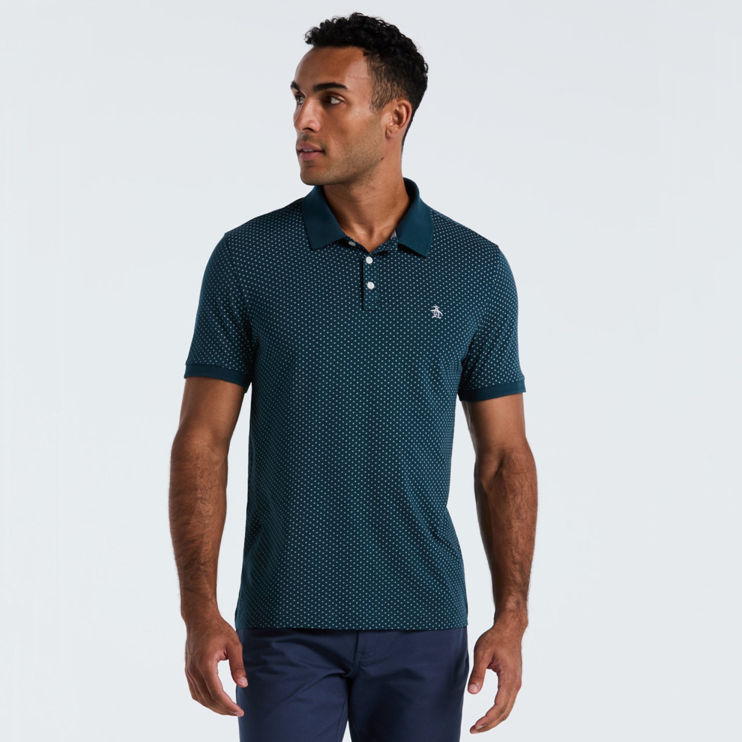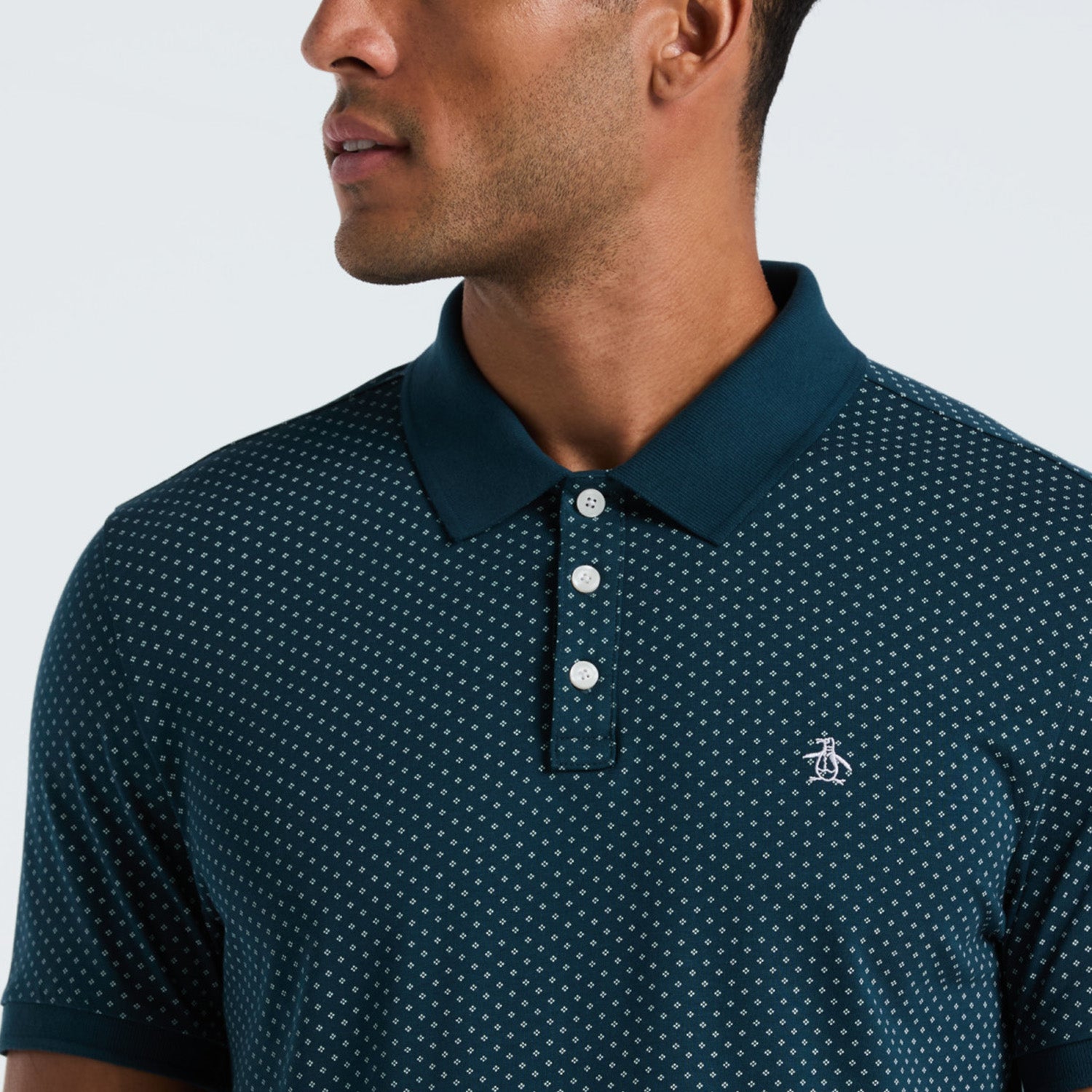 Este polo de algodón para hombre luce un estampado integral de rombos. El polo Original Penguin está confeccionado en un jersey de algodón suave y transpirable que te mantendrá fresco y cómodo. Su corte clásico, con mangas cortas y cuello polo, le da un toque de estilo preppy a tu vestuario casual.