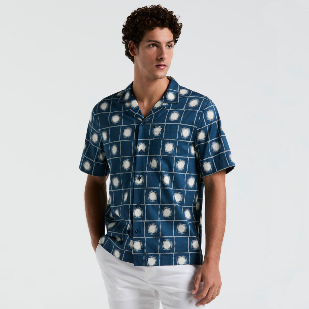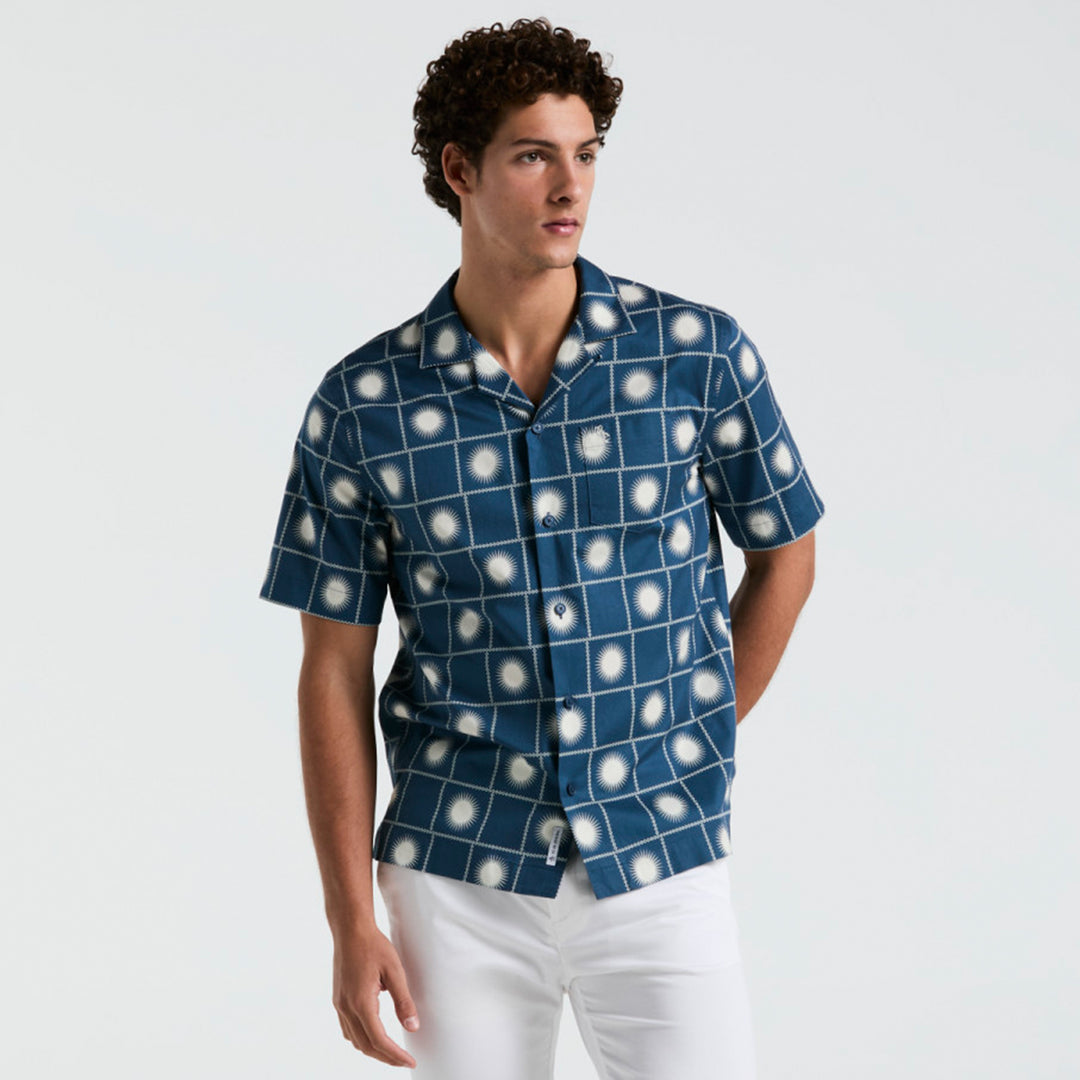 Esta camisa de manga corta con botones para hombre, estampada con un llamativo estampado de cuadros de sol, es una excelente manera de alegrar tu guardarropa. La camisa está confeccionada con una tela de sarga liviana que es cómoda de usar en climas más cálidos. Está mejorada con elasticidad para ayudarte a moverte libremente durante el día y rematada con un cuello alto para un estilo retro relajado. Los detalles como los botones reciclados y el 41 % de fibras de viscosa EcoVero™ en la tela agregan un toque sustentable a esta camisa de manga corta con botones fresca e informal.