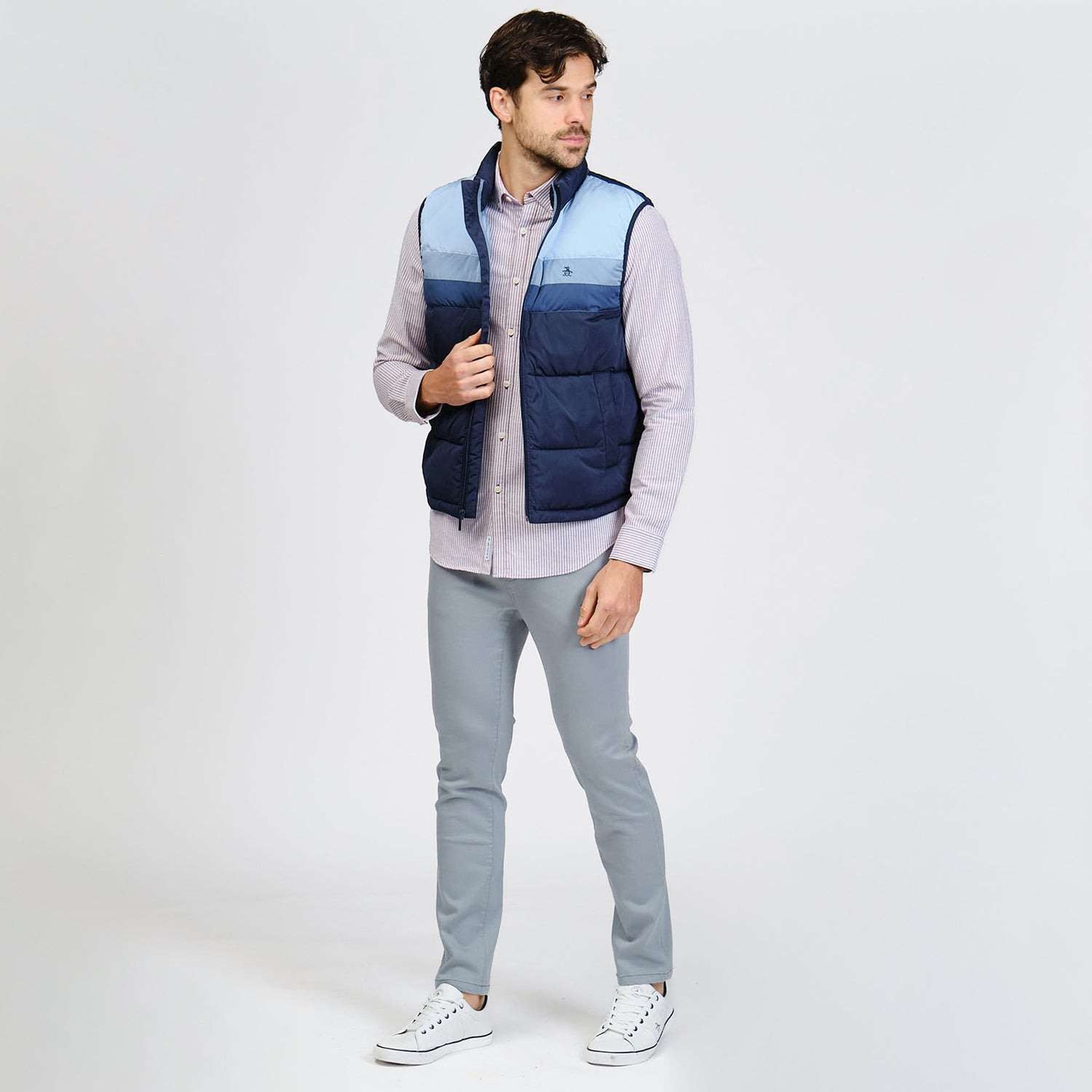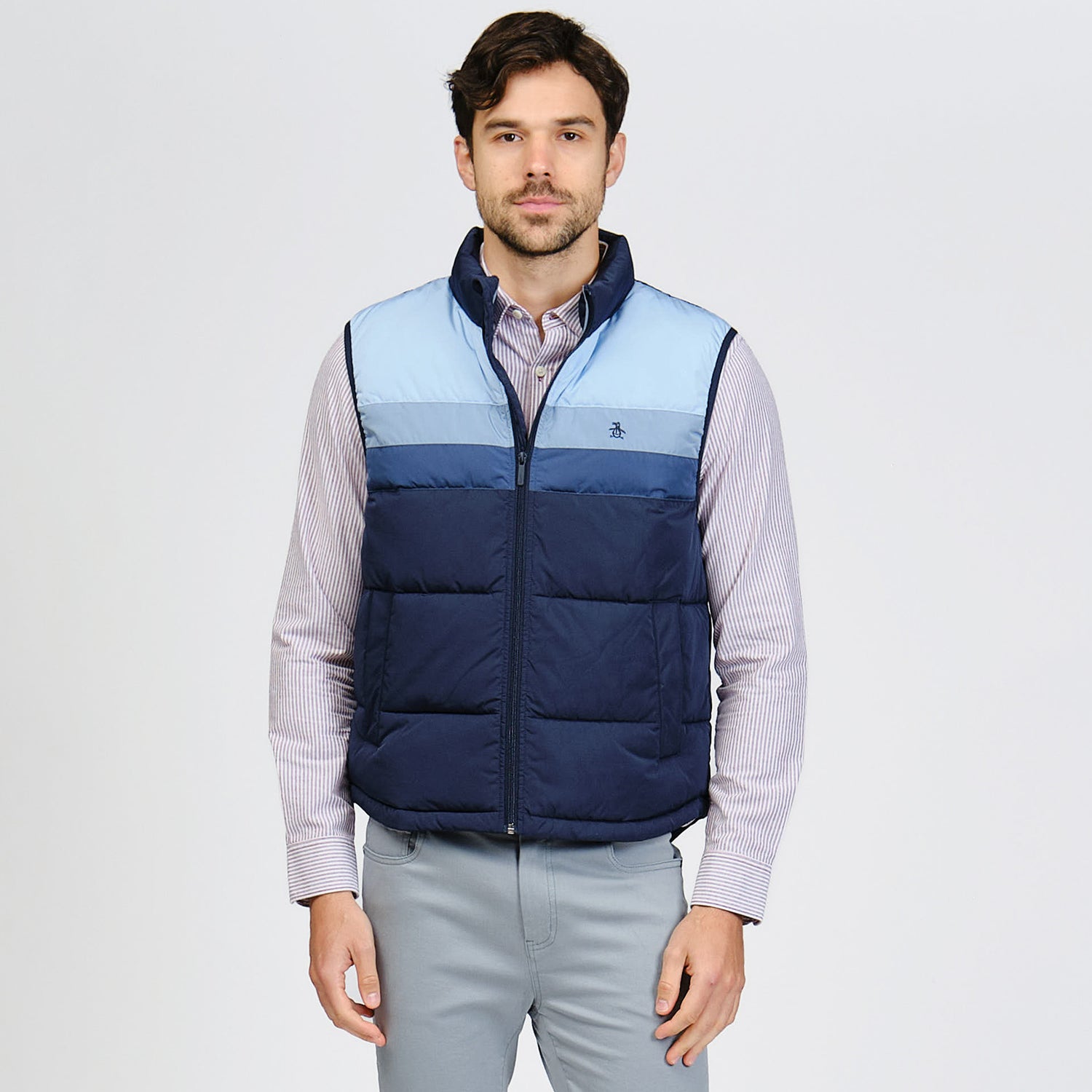 Ideal para climas de transición, este chaleco Original Penguin para hombre te aportará calidez sin agobiarte. Este chaleco sin mangas está confeccionado con un tejido liso ligero con acabado impermeable para mantenerte seco incluso con lluvia ligera. Su superficie de alta densidad le da un aspecto elegante a su versátil diseño liso.