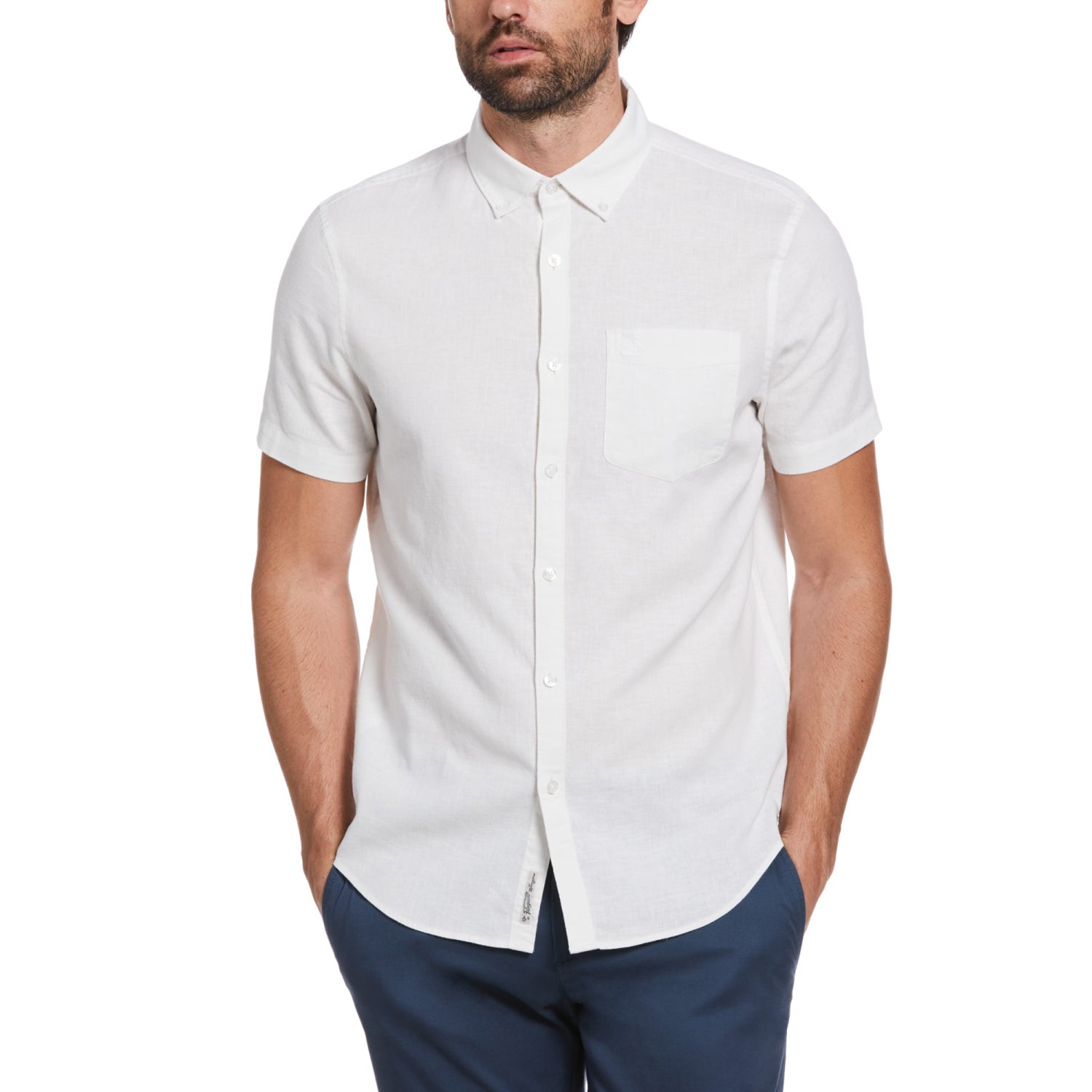 Manténgase fresco y cómodo en su próxima aventura soleada con esta camisa transpirable de mezcla de lino de Original Penguin. Esta camisa de manga corta para hombre está confeccionada con un tejido liso para una durabilidad excepcional. Tiene un toque de elasticidad para un ajuste flexible, y el cuello abotonado le da un aspecto elegante y elegante. Con un diseño versátil de color liso, es fácil de combinar con su ropa de verano.