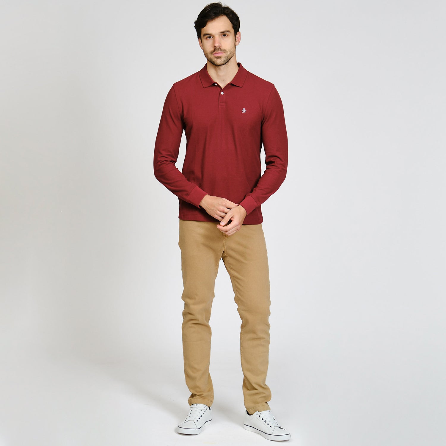 Lleva tu estilo de polo a nuevas alturas con este polo de manga larga para hombre de Original Penguin. Su versátil color liso combina a la perfección con una amplia gama de prendas inferiores, y el cuello de polo acanalado con tapeta de dos botones le da un look de polo atemporal. Está confeccionado en piqué, con cordones en relieve en la superficie del material para una textura sutil que garantiza que esta camisa de corte entallado se sienta tan bien como luce.