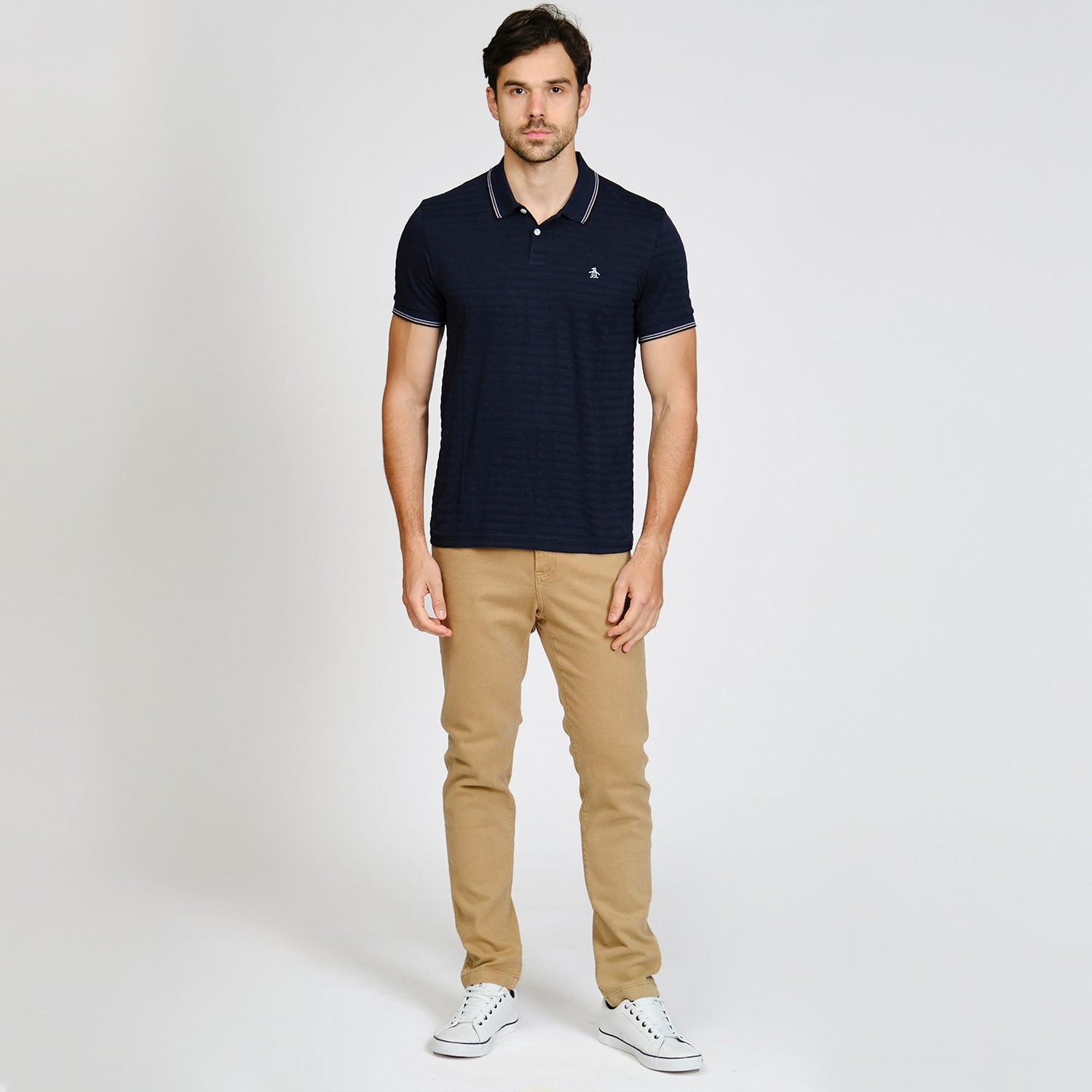 Con su estilo atemporal, este polo Original Penguin para hombre es una prenda versátil para tu armario casual. Está confeccionado en un suave tejido de jersey que se siente suave al tacto. Diseñado con un moderno corte entallado, este polo liso presenta rayas sutiles y mangas cortas para un look casual clásico y elegante.