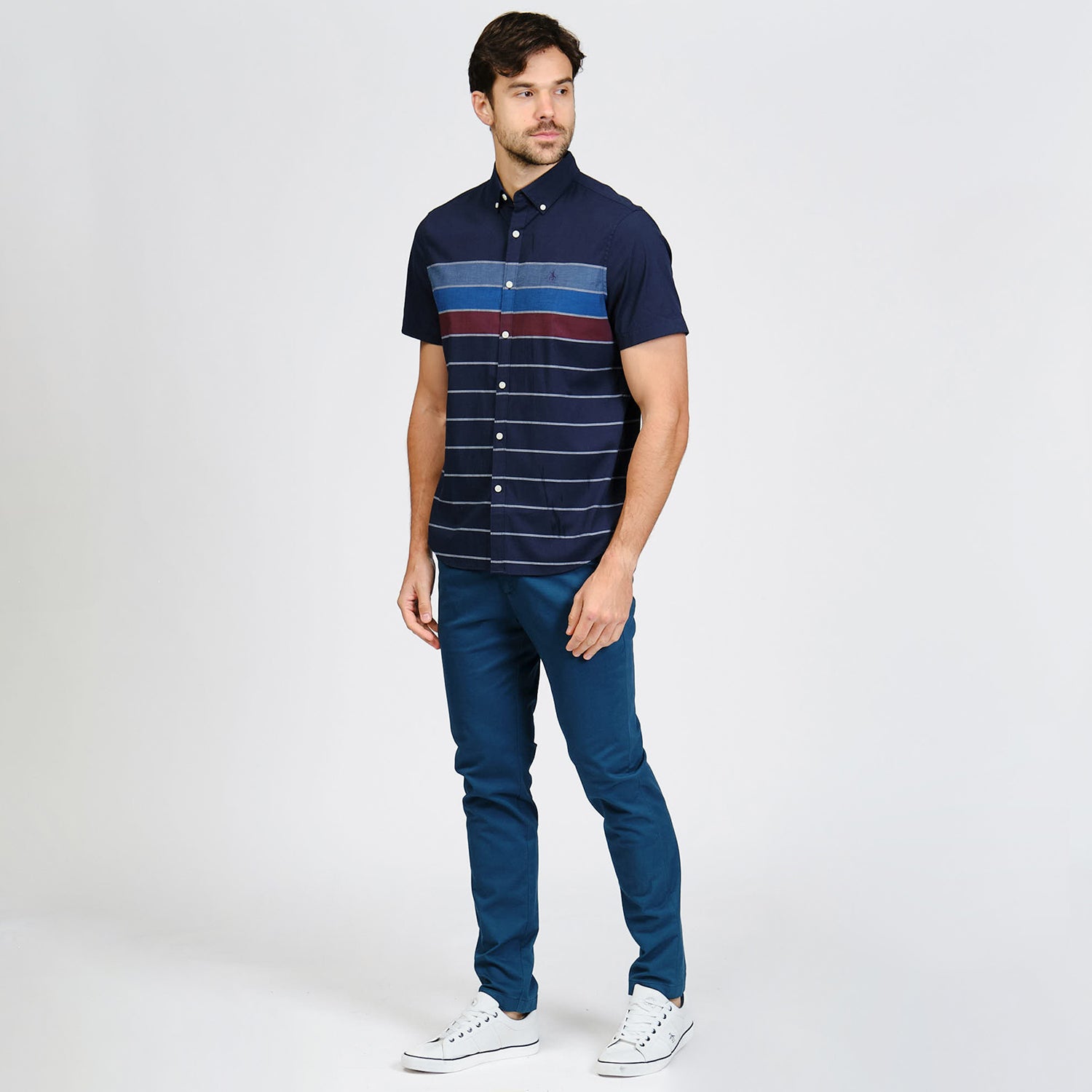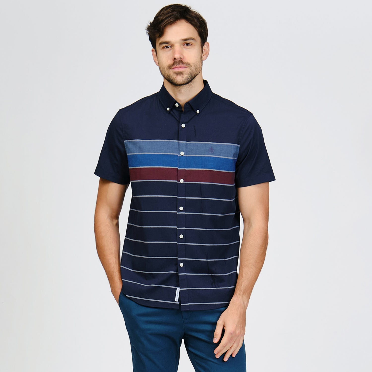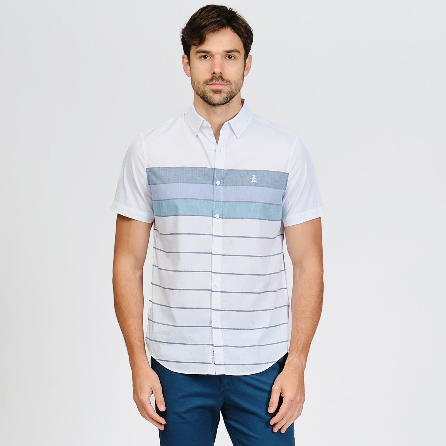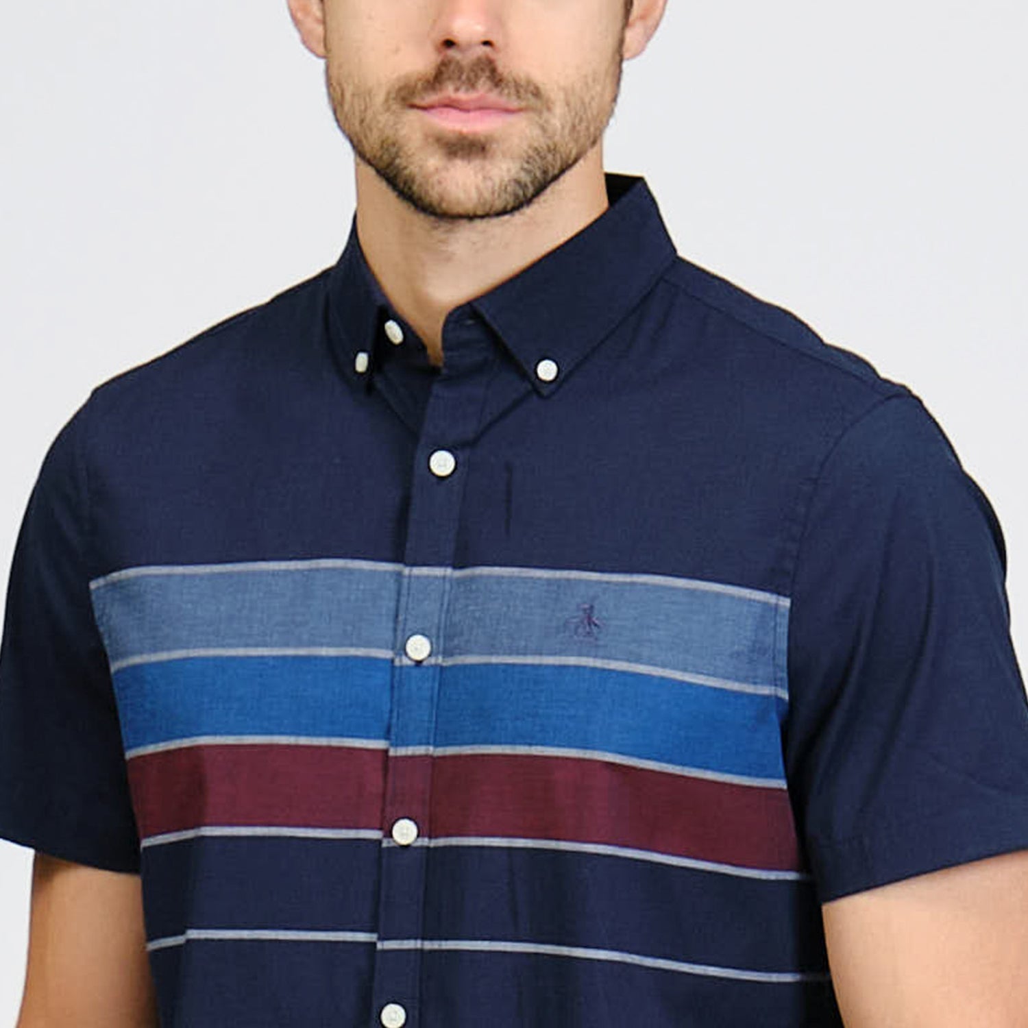 Eleva tu estilo casual con esta camisa manga corta de popelina con franja en pecho de Original Penguin. Diseñada para comodidad y estilo, esta camisa es perfecta para cualquier ocasión.