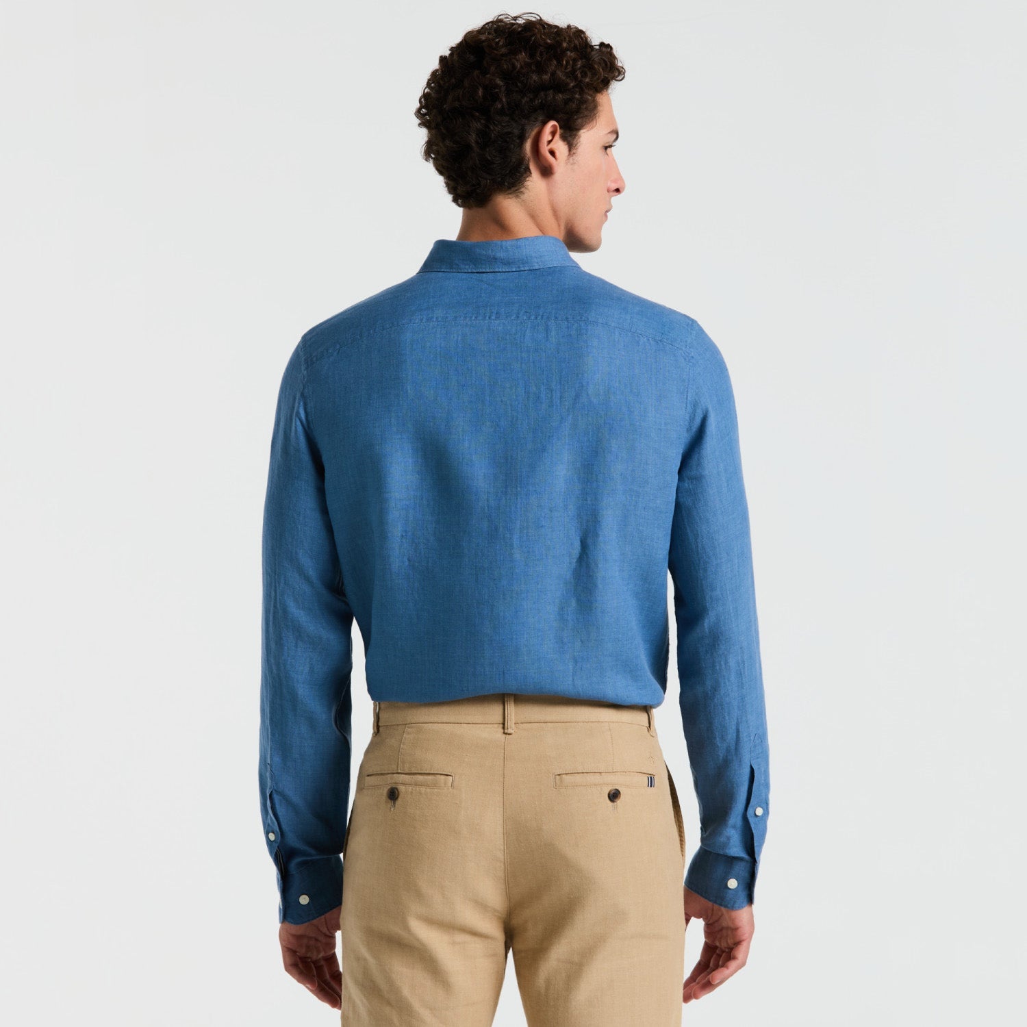 Añade sofisticación a tu armario con esta camisa manga larga 100% lino con bolsillo de corte impecable y diseño atemporal.