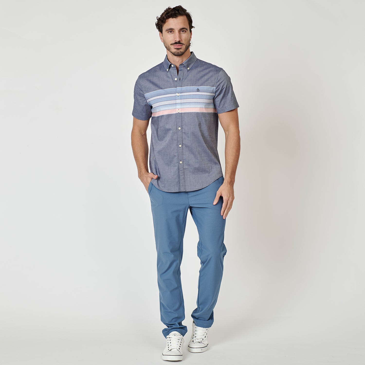 Eleva tu estilo casual con esta camisa manga corta con franja en pecho de Original Penguin. Diseñada para comodidad y estilo, esta camisa es perfecta para cualquier ocasión.