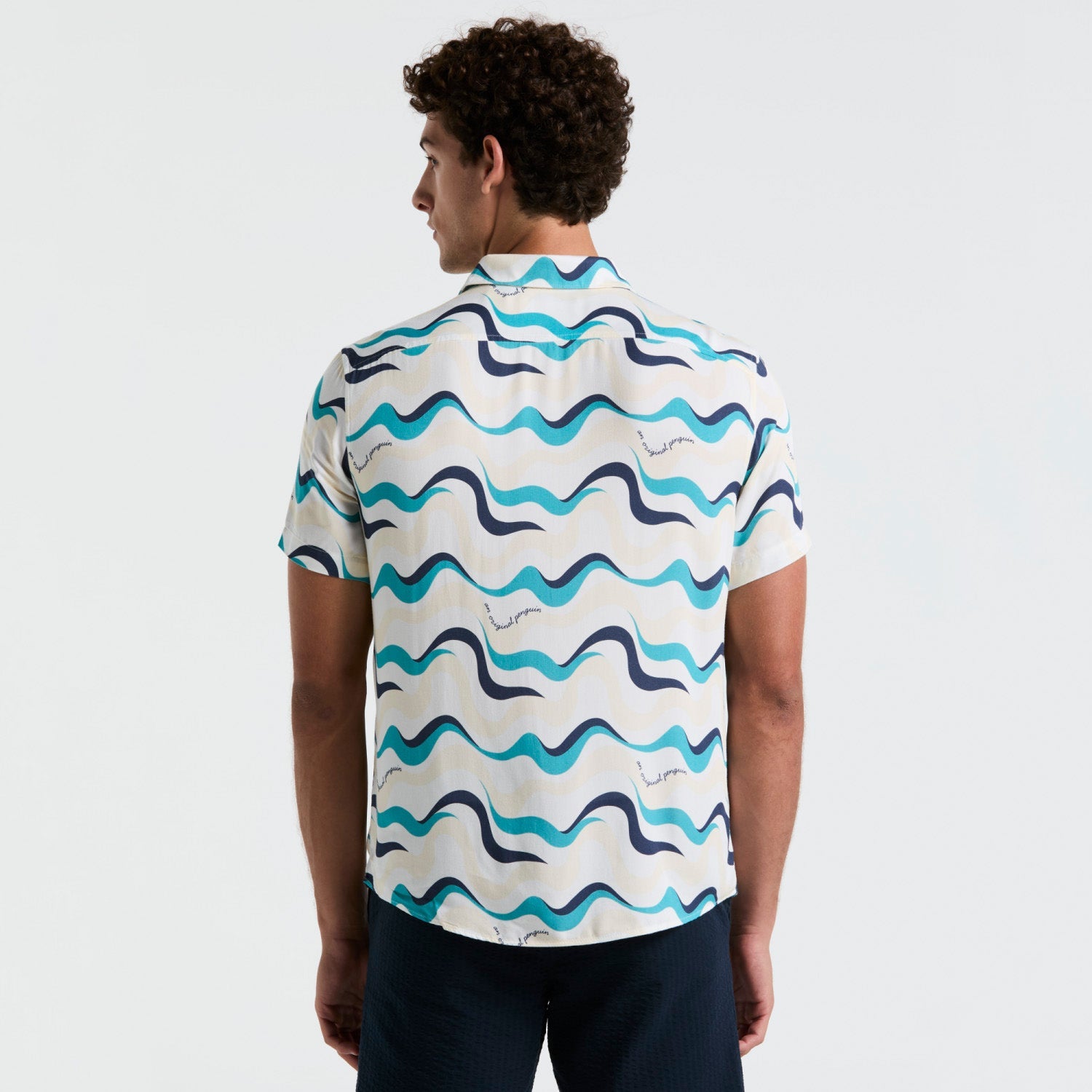Renueva tu guardarropa con esta camisa manga corta de viscosa full print multi olas que combina diseño contemporáneo con comodidad excepcional.