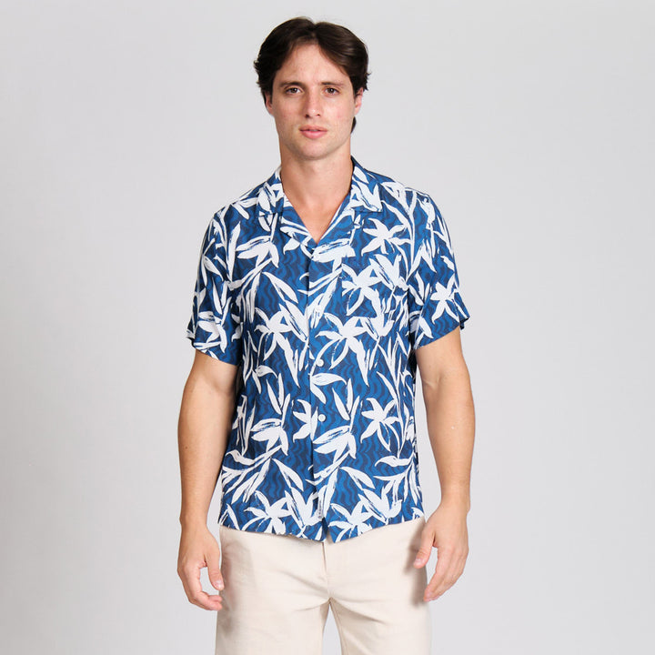 Esta camisa de manga corta cuenta con un estampado completo de palmeras en una tela de viscosa de alta calidad. Con un diseño moderno y veraniego, esta camisa te mantendrá fresca y cómoda durante todo el día. El tejido de viscosa es suave al tacto y proporciona un ajuste ligero y transpirable. Perfecta para un look casual y elegante.