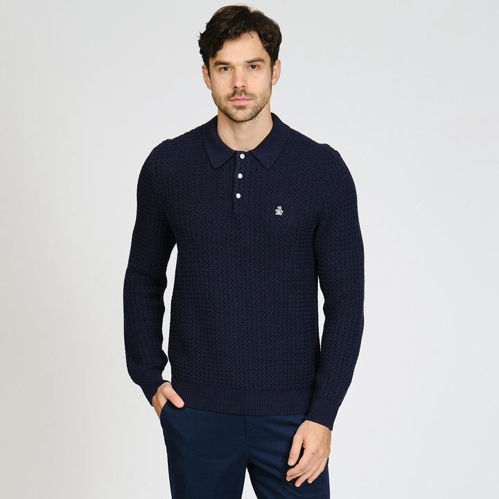 Este polo Original Penguin para hombre te dará un look informal y refinado con un toque visual intrigante. La camisa de manga larga está confeccionada en un cómodo tejido de punto de mezcla de algodón. Su corte entallado le da un perfil moderno, mientras que las costuras en zigzag le aportan un toque sutil. Llévalo solo o debajo de una chaqueta deportiva para un toque de sofisticación instantáneo.