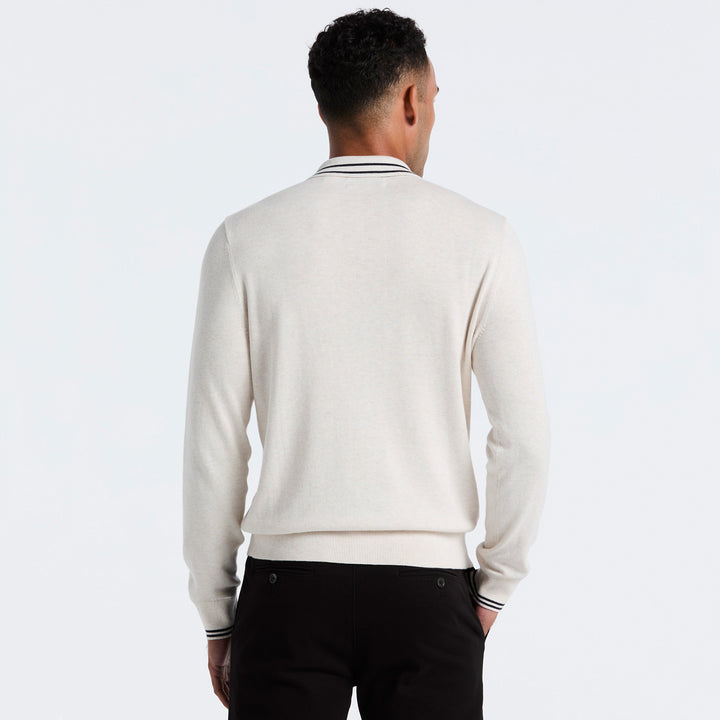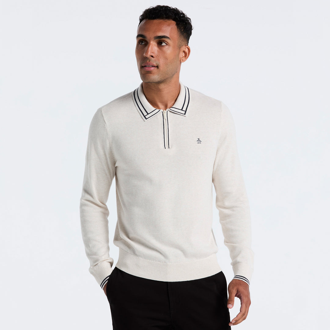 Una prenda básica, elegante y cómoda, para cualquier armario. Este jersey para hombre de Original Penguin está confeccionado en un punto ligero de 14GG. Este polo de manga larga está confeccionado en una suave mezcla de algodón y tiene un corte entallado que le da una silueta moderna. Los detalles de ribete en la tapeta con cremallera de un cuarto y el cuello añaden un sutil toque de contraste.